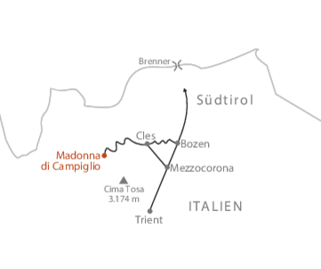 Am Anreisetag treffen wir uns um 15:00 Uhr in der Bar "Jumper" direkt an der Talstation der Groste-Seilbahn in Madonna di Campiglio. Adresse: Funivia Grostè, Campo Carlo Magno, I-38086 Madonna di Campiglio, Tel.: +39-0465-441508. Bei unerwarteter Verspätung bitten wir, dich über diese Telefonnummer mit dem ASI-Bergführer in Verbindung zu setzen.