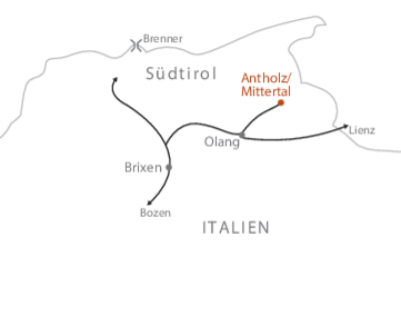 BAHN: über Franzensfeste/Fortezza bis Bhf. Olang/Valdaora. Ab diesem Bahnhof verkehrt nach jeder Zugankunft der Bus 431 direkt bis zur Haltestelle "Antholz/Mittertal" (€3 p.P.). Das Hotel liegt unmittelbar gegenüber der Bushaltestelle.