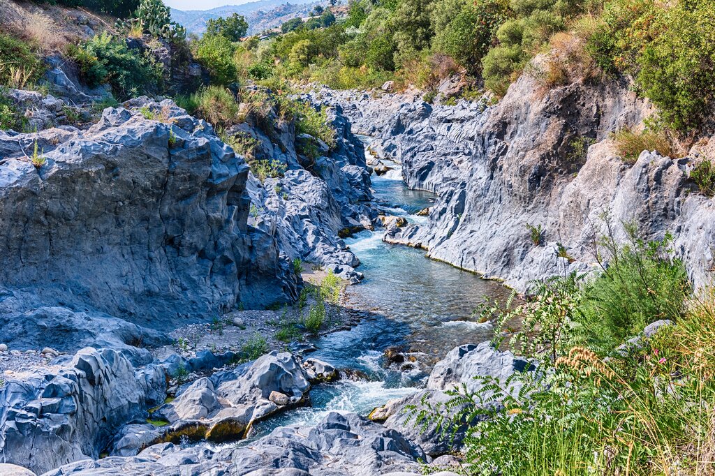 <Heute besuchen wir die beeindruckende Alcantara-Schlucht. Zunächst machen wir einen kurzen Bummel durch das mittelalterliche Castiglione, das hoch über der sanften Ebene thront. Danach führt uns unsere Wanderung entlang des Flusses auf malerischen Wegen, gesäumt von Trockenmauern und Weinfeldern. Immer wieder durchqueren wir verwunschene Olivenhaine, passieren eine byzantinische Kirche und genießen dabei den atemberaubenden Blick auf den Ätna, der über uns thront. Am späten Mittag erwartet uns ein Besuch in einem der örtlichen Weingüter. Bei einem leichten Mittagessen probieren wir verschiedene, kräftige Weine – charakteristisch für die mineralreiche Vulkanerde, auf der die Trauben gedeihen.