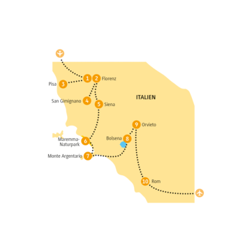 <Heute nimmst du Abschied von Florenz und fährst weiter nach Siena. Die mittelalterliche Stadt liegt malerisch inmitten endloser Weinberge. Hier spazierst du durch enge Gassen, vorbei an Türmen und Adelspalästen. In der Mitte der Stadt steht der aus schwarzem und weißem Marmor gebaute Dom, der mit seiner gotischen Architektur imponiert. Ende des Rundgangs ist auf der Piazza del Campo, auf der seit 1644 zweimal jährlich ein historisches Pferderennen, der sogenannte »Palio« ausgetragen wird. Was in großen Teilen Italiens der Fußball ist, das ist in Siena die Leidenschaft für den Palio. Die unterschiedlichen Stadtviertel, die sogenannten Contraden, treten hierbei gegeneinander an und verwandeln die ganze Stadt in ein historisches Stadtfest. Du schaust dir die Geschichte des Palio ein bisschen genauer an und stattest einem Museum und Mitglied einer Contrade einen Besuch ab. Am Nachmittag geht es weiter nach San Galgano, zur Ruine der Zisterzienserabtei. Gleich wirst du erfahren, was es mit der Legende des Schwerts im Stein auf sich hat. Der Tag endet in der Nähe von Grosseto, wo deine Unterkunft für die nächsten zwei Nächte liegt.
