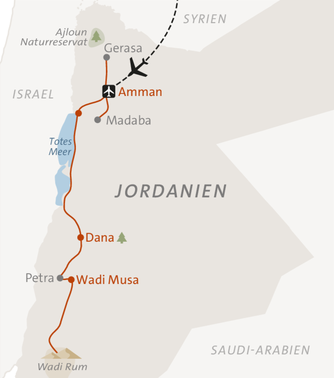 Nur wenige Flugstunden von Europa liegt ein Königreich voll mit landschaftlichen Juwelen: das Wadi Rum, die Naturreservate von Dana, das Tote Meer oder das unvergleichliche Petra. Eine bezaubernde nahöstliche Kultur, die von Beginn an durch ihre Gastfreundschaft fasziniert. Im Wadi Rum finden wir uns in einer der schönsten Wüsten der Welt wieder. Übertroffen kann diese Landschaft nicht werden, trotzdem stehen wir staunend vor dem Kulturwunder Petra - der in Fels gehauenen Stadt, die UNESCO Weltkulturerbe ist. Danach floaten wir schwerelos im Toten Meer.