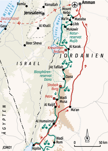 <Mukawir befindet sich rund 800 Meter über dem Meeresspiegel, doch der Beginn unserer heutigen Tour wird uns rasch zum tiefsten Punkt der Erde führen, zum Ufer des Toten Meeres, welches 400 Meter unter dem Meeresspiegel liegt. Wir brechen früh auf, um auf ruhigen Nebenstraßen zu den Küsten des Toten Meeres zu gelangen. Wir baden im Naturreservat Mujib und testen die erstaunliche Oberflächenspannung des Salzwassers (rund 10-mal salziger als herkömmliches Meereswasser). Wir verlassen die Ufer des Toten Meeres und treten den herausfordernden Rückweg über eine 25 Kilometer lange Steigung zum Gipfel des Ostplateaus an ( 900 m Seehöhe). Falls Sie diese anstrengenden 1300 Höhenmeter nicht mit dem Bike bewältigen möchten, steht Ihnen das Begleitfahrzeug zur Verfügung. Nach unserer Ankunft in Karak besichtigen wir die Kreuzritterfestung. In einer prachtvollen Lage auf dem King's Highway situiert, ist diese Festung ein exzellentes Beispiel der Kreuzritterarchitektur des 12. Jahrhundert. Danach erfolgt das Einchecken im Hotel.Bike-Etappe: 90 km / ca. 7 - 8 StundenBeim Reisetermin 27.04.- 05.05. wird das Mujib Hotel in Karak gebucht. -