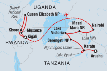 Ob du einen düsteren Silberrücken-Gorilla in seinem natürlichen Lebensraum beobachtest, 600 Meter auf den Boden des vulkanischen Ngorongoro-Kraters hinabsteigst oder Zeit mit einer Hadzabe-Gemeinde in Tansania verbringst - diese 18-tägige Tour bietet Möglichkeiten, Reiseerinnerungen zu schaffen, von denen die meisten Menschen nur träumen. Reise durch Ruanda, Uganda, Kenia und Tansania auf der Suche nach einigen der mythologischsten Tiere der Welt. Unterwegs triffst du Einheimische und lernst die Vielfalt der Kulturen in Ostafrika kennen - von den Massai-Stämmen über die Dorfbewohner am Rande des Queen Elizabeth Nationalparks bis hin zu den hippen Arbeitern im Nyamirambo-Viertel von Kigali.