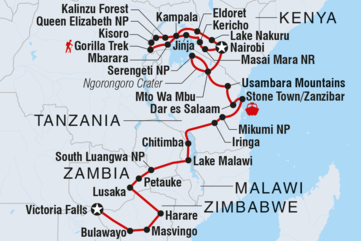 Verbringe 42 Tage auf einer Reise durch die beeindruckenden Landschaften Ostafrikas. Suche im dampfenden Dschungel Ruandas nach dem seltenen Berggorilla, genieße aufregende Safaris durch üppige Wälder und offene Savannen und beende deine Reise an den Victoriafällen. Lass dich in kleinen Dörfern in Tansania und Malawi willkommen heißen, entspanne dich an den Sandstränden Sansibars und verfolge die Big Five im Ngorongoro-Krater und im Serengeti-Nationalpark. Dieses Überlandabenteuer ist eine Mischung aus geführten Ausflügen vor Ort und freier Zeit, um deinem Herzen zu folgen und das zu sehen, was du sehen willst.