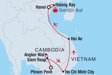 <Verbringe heute einen ganzen Tag damit, die beeindruckenden Tempel von Angkor zu besichtigen - diese UNESCO-Weltkulturerbestätte ist einer der wichtigsten historischen Komplexe in ganz Südostasien und ein absolutes Muss in Kambodscha! Wenn du Angkor Wat bei Sonnenaufgang sehen möchtest - das größte und vollständigste Bauwerk und der einzige Tempel mit einem nach Westen ausgerichteten Eingang - kann dein Reiseleiter einen frühen Besuch vor Sonnenaufgang für dich organisieren (optional). Später am Morgen wird deine Gruppe die Anlage gemeinsam besichtigen. Von allen besuchten Tempeln ist der Bayon mit seinen über 200 lächelnden, geschnitzten Gesichtern und mehr als 50 gotischen Türmen das Herzstück. Du besuchst auch ein altes Kloster, wo du einen buddhistischen Mönch triffst und an einem Ritual teilnimmst, das seit Tausenden von Jahren überlebt hat. Setz dich auf den Boden, während der Mönch singt und dich mit Weihwasser besprengt, bevor er einen heiligen Faden um dein Handgelenk bindet, der dir Schutz und Glück für den Rest deiner Reise verspricht. Zum Mittagessen besuchst du heute das Spoons Restaurant and School, in dem benachteiligte Jugendliche aus der Region Fähigkeiten erlernen, die ihnen eine Anstellung im Gastgewerbe ermöglichen. Danach geht es weiter nach Ta Prohm - ein Tempel, in dem die Natur die Oberhand gewonnen hat, denn große Bäume dominieren die steinernen Fundamente. Wenn du Angkor Wat in seiner ganzen Pracht sehen willst, kannst du den Tag auch mit einem Blick auf die Tempel bei Sonnenuntergang ausklingen lassen - sprich einfach mit deinem Reiseleiter.