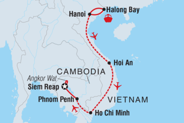 - Hotel (8 Nächte), Übernachtung in der Halong-Bucht mit dem Boot (1 Nacht), Siem Reap (3 Nächte)