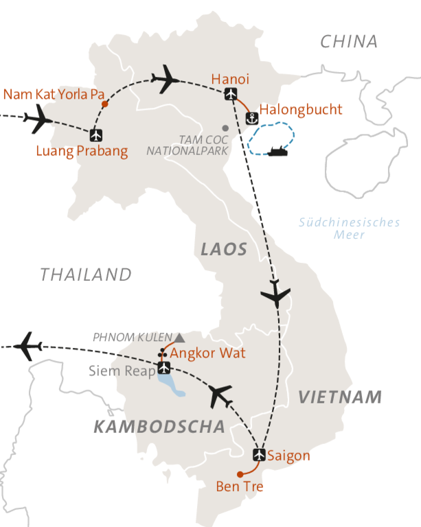 Auf dieser Reise entdecken Sie Laos, Vietnam und Kambodscha – Länder voller faszinierender Landschaften, reicher Kultur und gastfreundlicher Menschen. Vom ruhigen Mekong in Luang Prabang über die Wasserwege des Mekong-Deltas, die lebendigen Straßen Hanois und Saigons bis zur Halong Bucht, die Sie auf einem Segelboot erkunden, erleben Sie unvergessliche Szenen. Radtouren durch Reisfelder, Bootsfahrten, Begegnungen mit Einheimischen und der Besuch historischer Bauwerke wie Angkor Wat lassen Sie tief in das tägliche Leben und die Geschichte dieser drei Länder eintauchen.