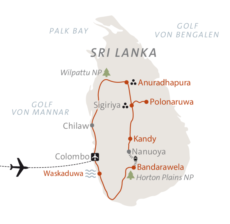 <Unsere Reise beginnt mit dem Nachtflug nach Colombo. Während wir abheben, wächst die Vorfreude auf Sri Lanka – eine Insel voller Farben, Düfte und Kontraste.