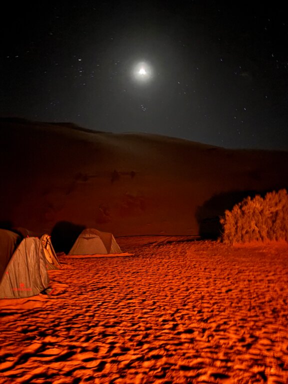 Mobiles Zeltcamp in der Wüste: Am Ende unserer Wanderung schlagen wir unser mobiles Zeltcamp direkt zwischen den Dünen auf. Wer ein Doppelzimmer gebucht hat, teilt sich ein Igluzelt, während Einzelzimmerbucher ihr eigenes Zelt genießen. Das Camp ist gut ausgestattet – mit Schaumstoffmatratzen, einem Aufenthaltszelt, einem Toilettenzelt, einfachen Sitzgelegenheiten und Küchenausrüstung. Es gibt zwar keine Duschen, aber in der Regel Wasser zum Waschen. Deine Mithilfe beim Auf- und Abbau der Zelte ist herzlich willkommen – nach drei Nächten bist du sicher ein Profi darin!