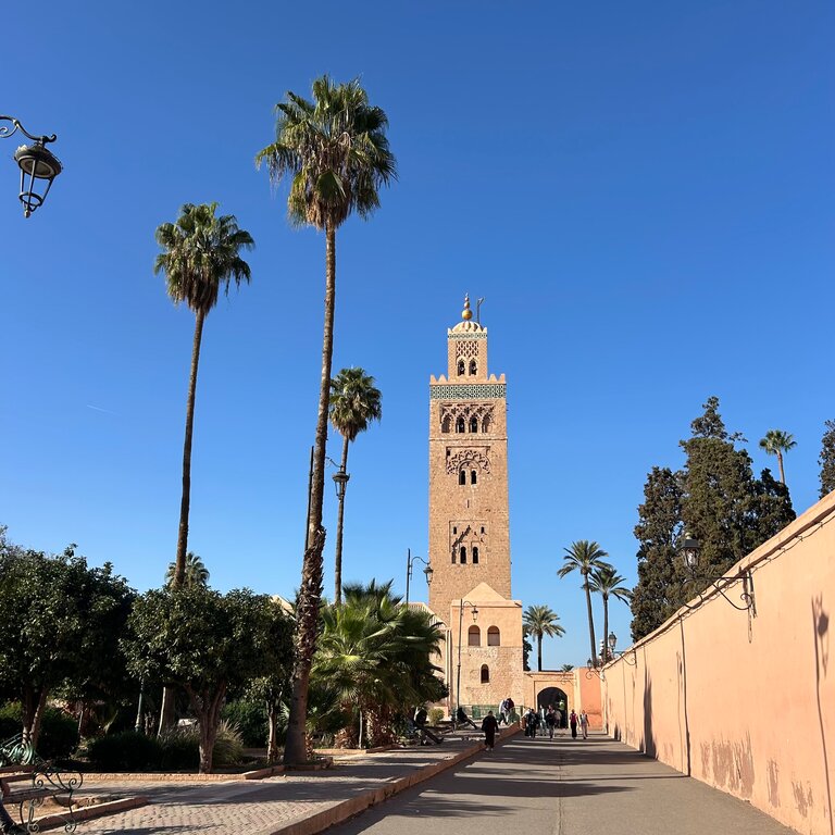 <Am Morgen geniessen Sie zunächst einmal einen marokkanischen Tee/Kaffe auf dem berühmten Platz Djemaa el Fna, der von der UNESCO als eines der Meisterwerke des mündlichen und immateriellen Erbes der Menschheit gewürdigt wird. Anschliessend stürzen wir uns ins Geschehen und hinein in das Labyrinth des Souks der Medina, die ebenfalls 1985 von der UNESCO zum Weltkulturerbe erklärt wurde. Auf verschlungenen Wegen geht es durch enge Gassen, der Medina (Altstadt) mit ihren vielen Sehenswürdigkeiten: Die Koutubia Moschee, den riesigen Platz Djemaa el Fna (Versammlungsort der Toten), die farbenprächtigen Souks mit ihren orientalischen Düften, die Saadier Gräber mit dem Bab Agnau, dem schönsten Tor von Marrakech aus der Zeit der Almohaden aus dem 12 Jh. und der Bahia (Schönheit) Palast, einem ehemaligen Palast eines Großwesirs mit wunderbarer orientalischer Dekoration.