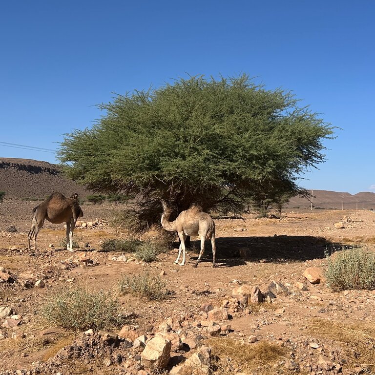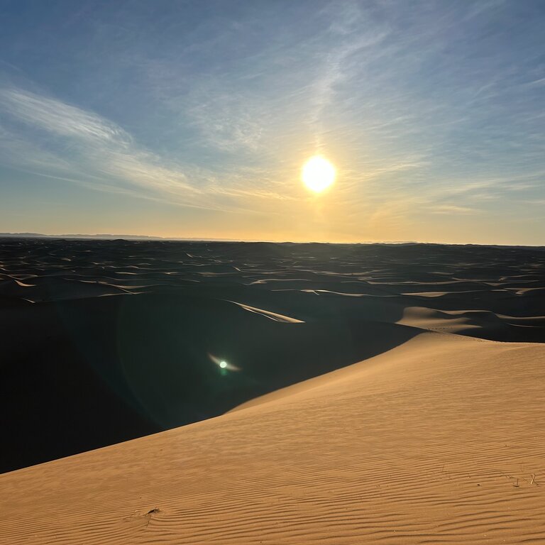 <Ihr verbringt einen entspannten Morgen unter den Dattelpalmen und am Pool und bereitet Euch auf den Wüstenausflug vor. Von Zagora aus geht es bis zum Rand der Sahara nach M’hamid, dem Tor zur Wüste. Mit dem 4x4 geht es über Sanddünen ca.1,5 Std. bis zum Wüstencamp inmitten der Dünen. Kamelritt am Nachmittag (optional) Sonnenuntergang auf einer der riesigen Sanddünen inklusive. Funkelnde Sterne am Wüstenhimmel machen die Nächte in der Wüste unvergesslich.