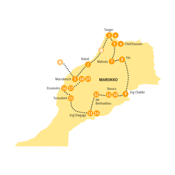 - 18 Übernachtungen in Hotels und Gästehäusern (Riads) sowie in einem komfortablen Zeltcamp in der Sahara