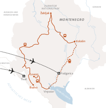Die Anreise ist sowohl über Tivat (TIV) als auch über den Flughafen Podgorica (TGD) möglich. Der Flughafentransfer ist von und zu beiden Flughäfen ohne Aufpreis inklusive. Für weitere Informationen und zur Buchung eines Fluges nach Podgorica wende dich bitte an unsere Reisespezialist:innen.