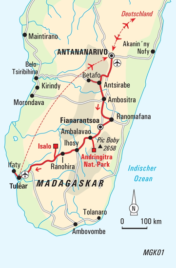 Trekkingreise durch Wildreservate, Nationalparks und Gebirge im Süden mit Überschreitung des Andringitra-MassivsLandschaftliche Höhepunkte unserer Reise sind die Überschreitung des Andringitra-Gebirges mit seinen eindrucksvollen Felsformationen aus Granitstein sowie unsere Wanderungen im Isalo-Nationalpark. Zwischen Felsgrotten und tiefen Schluchten führt unser Weg ins Tal der Affen. Die Kattas hangeln sich morgens an den steilen Wänden hinunter, um zu trinken. An der Ostküste besuchen wir Reservate im Regenwald und können dort neben Lemuren und Makis eine faszinierende Pflanzenvielfalt entdecken – Farne, Lianen, Vanille und Kannenpflanzen sind nur einige der dort zu entdeckenden Flora. Genauso vielfältig sind die Einwohner dieses Landes. Madagaskar wurde vom Westen her von afrikanischen, ostwärts von asiatischen Völkern besiedelt. Wir wandern in der Betafo-Region über kleine Dörfer und treffen unterwegs Bauern zwischen Reisterrassen und Ackerland. Zum Abschluss lassen wir die Reise an den Stränden des Indischen Ozeans im Fischerdorf Ifaty im Schatten der Palmen entspannt ausklingen.