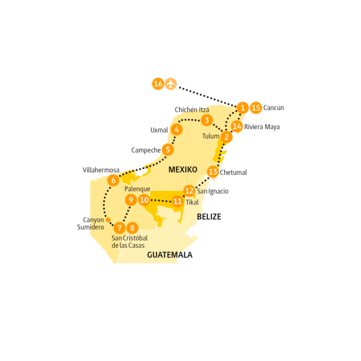 <Ein spannender Besuch und eine Reise in die Vergangenheit erwarten dich beim Rundgang über die ehemalige Sisal-Hacienda von Sotuta. Du lernst die verschiedenen Prozesse der Henequen-Verarbeitung kennen. Dann geht es weiter mit einem Pferdewagen, der hier Truk genannt wird, durch weitläufige Agavenplantagen. Spätestens beim kühlen Bad in einer wunderschönen Cenote kehrst du in die Gegenwart zurück, denn ganz sicher wirst du beim Baden das Hier und Jetzt genießen. An der UNESCO-Weltkulturerbestätte Uxmal siehst du später unter anderem die Pyramide des Wahrsagers und den Gouverneurspalast. Du fragst dich, was es mit der Maske und der rüsselförmigen Nase auf sich hat, die sich hier an fast allen Bauten findet? Diese Maske verkörpert den Regengott Chac. Und weil es hier so selten regnet, drehte sich bei den Maya alles um ebendiesen Gott. Wir hoffen jedoch, dass für dich heute die Sonne scheint. Wenn diese bald untergeht, erreichst du die Hafenstadt Campeche.