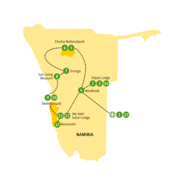 Deine Reiseleitung nimmt dich am Flughafen von Windhoek in Empfang und bringt dich zu deiner Unterkunft. Die reizvolle Landschaft, die gastfreundliche Atmosphäre und die gute Küche bilden den idealen Rahmen, um sich vom Flug zu erholen. Schon am Nachmittag fährst du durch den Wildpark und machst dich im offenen Geländewagen etwa zwei Stunden auf die Suche nach Oryxantilopen, Springböcken und Straußen. Den spektakulären Sonnenuntergang gibt es inklusive.