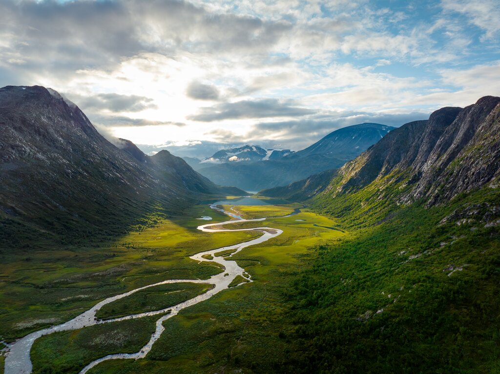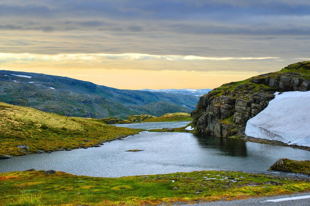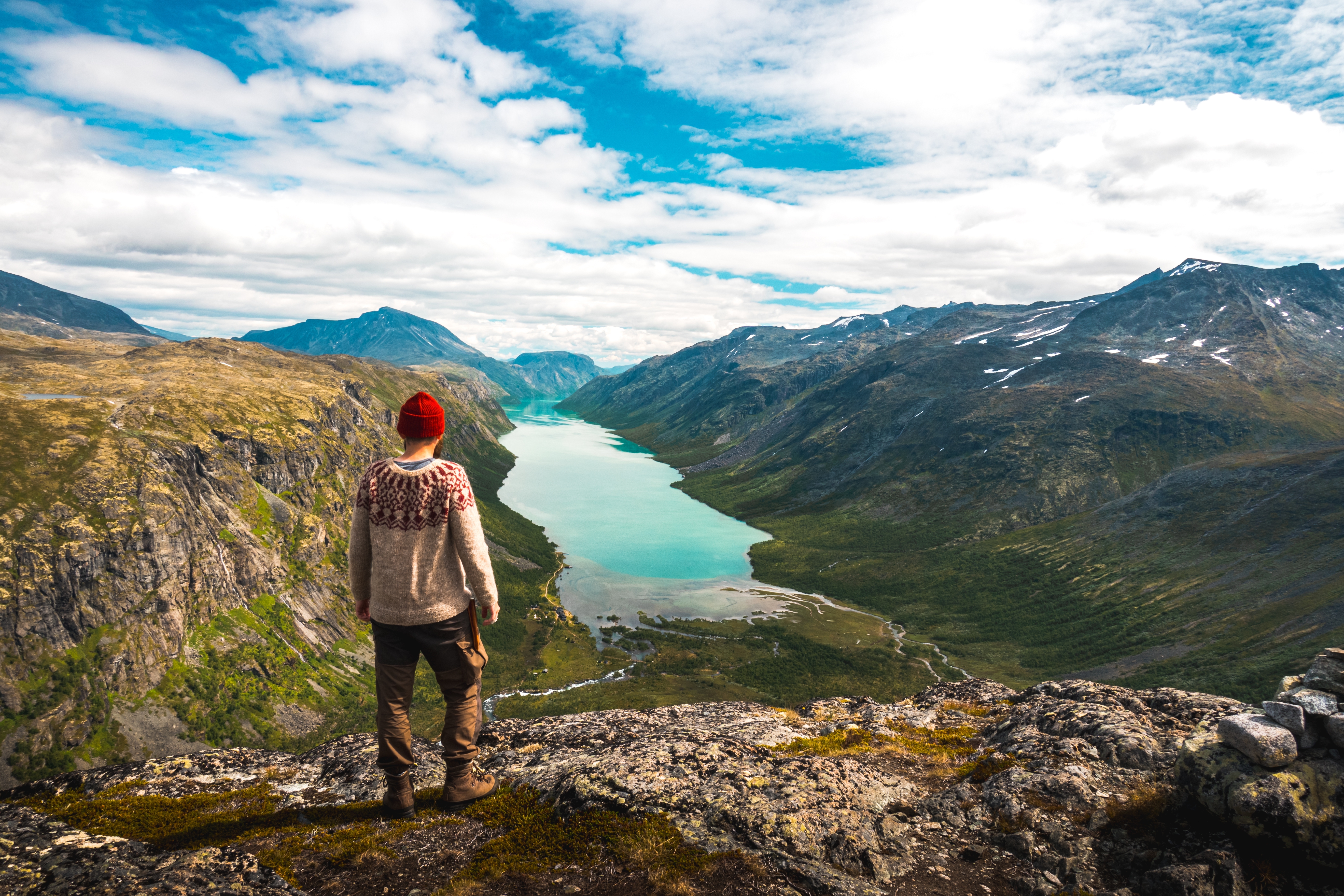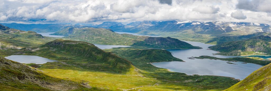 <Nach dem Frühstück brechen wir auf und fahren mit unserem privaten Bus ins Tal von Gol und weiter auf die Ostseite des Nystølsfjellet. Hier sind wir bereits oberhalb der Baumgrenze und tauchen in eine wilde, ursprüngliche Landschaft ein. Über kleine Gipfel und vorbei an funkelnden Gebirgsseen führt uns der Weg Richtung Westen. Bei gutem Wetter werden wir mit einem grandiosen Panorama belohnt, das bis zu den schneebedeckten Gipfeln des Jotunheimen-Gebirges reicht – dem höchsten Gebirge Norwegens.