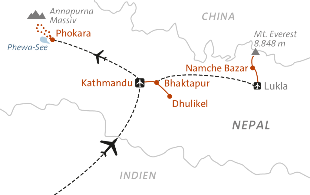Nepal, das Land der höchsten Gipfel der Erde, fasziniert mit großartiger Natur und reicher Kultur. Im Angesicht mächtiger Eisriesen begeben wir uns auf ein Wanderabenteuer. Wir starten im Kathmandutal und entdecken gleich zu Beginn die beeindruckende Vielfalt des kleinen Landes. Im Everestgebiet, umgeben von gewaltigen Sieben- und Achttausendern, wandern wir vorbei an rauschenden Wasserfällen, Gebetsmühlen, Manimauern und Chörten. Danach erleben wir drei Tage die nicht minder eindrucksvolle Bergwelt des Annapurna mit wunderschönen Reisterrassen und urigen Dörfern. Selbst in abgelegenen Regionen übernachten wir in komfortablen, gemütlichen Lodges und müssen auf dem Komfort von Zimmern mit Dusche und WC nicht verzichten.