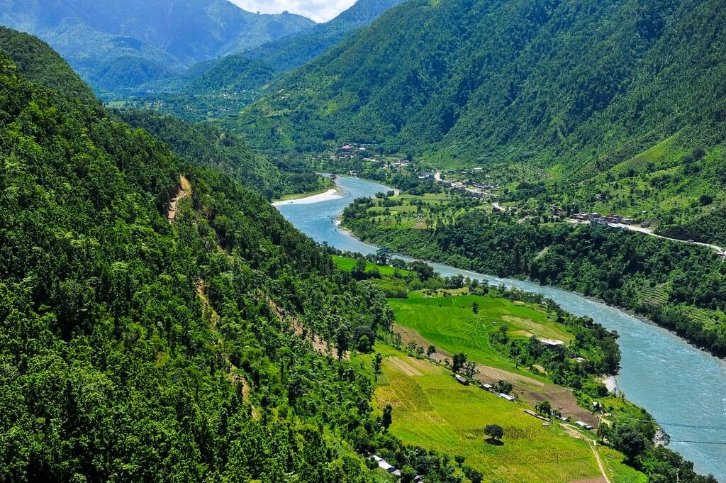 <Nach einem gemütlichen Frühstück fahren wir entlang des Narayani-Flusses bis nach Charaudi, dem Ausgangspunkt für unsere Rafting Tour. Mit dem Boot geht es nun durch die abwechslungsreiche Flusslandschaft am sanften Trishuli-Fluss bis Kurintar (wer nicht raften möchte kann auch mit dem Bus fahren). Von hier wandern wir über eine kurze und stabile Hängebrücke weiter zu unserem Resort.