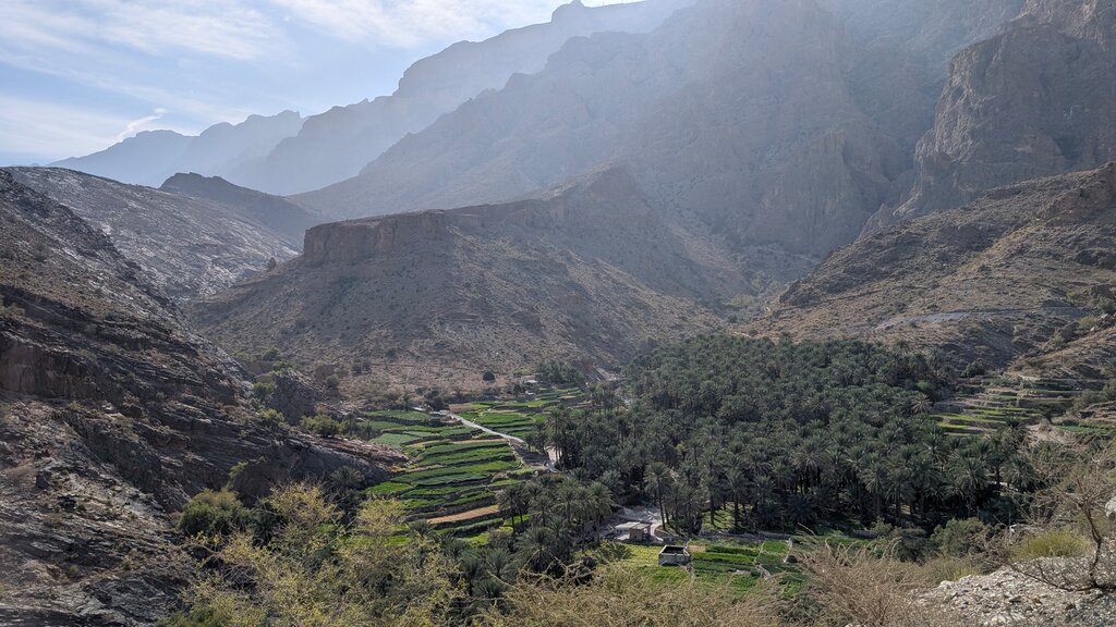 <Wir fahren nach Balad Sit und wandern durch eine enge Schlucht, die sich am Ende mit einem grandiosen Blick über Oase und Terrassenfelder öffnet. Über den Pass von Sharaf Al Alamain erreichen wir Bait As Safah, ein restauriertes Lehmhaus. Frauen des Dorfes zeigen uns, wie sie Kaffee rösten, Brot backen und aus frischen Kräutern Öl und Salben herstellen. Anschließend spazieren wir durch Misfat Al Abreyen, ein malerisches Bergdorf mit verwinkelten Gassen und üppiger Palmenoase.