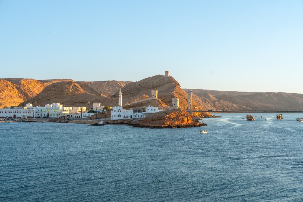 <Gegen Mittag beginnen wir unsere erste Erkundungstour in Maskat. Vor dem Palast des Sultans halten wir inne und bestaunen die prachtvolle Fassade, die nur offiziellen Anlässen vorbehalten ist. Anschließend wandern wir auf dem Riyam Trek durch das Gebirge von Muttrah. Von oben eröffnet sich ein fantastischer Blick über den tiefblauen Hafen mit seinen traditionellen Dhaus und den weißen Häusern der Stadt. Der Weg endet direkt im Souk von Muttrah, wo wir durch enge Gassen schlendern, den Duft von Weihrauch und Gewürzen in der Nase und funkelnde Lampen über uns. Am Abend fahren wir zurück ins Hotel.