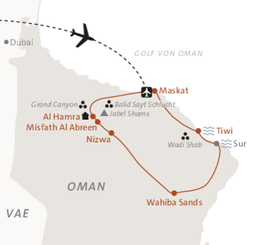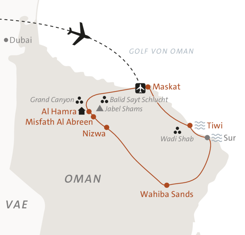 Der Oman begeistert mit einer einzigartigen Mischung aus ursprünglicher Natur, jahrtausendealter Kultur und arabischer Gastfreundschaft. Auf unseren Wanderungen entdecken wir schroffe Gebirge, tiefe Canyons und die grünen Oasen der Wadis, in denen Wasserläufe für üppiges Leben mitten in der Steinwüste sorgen. Wir ziehen durch Sanddünen, über steinige Bergpfade und klettern über Felsblöcke in verwunschenen Schluchten. Gleichzeitig lassen wir uns vom Zauber alter Karawanenstädte, prächtigen Festungen und dem Duft orientalischer Märkte verzaubern. Zugleich ist Oman ein modernes Land, das in den letzten 30 Jahren eine enorme Entwicklung erfahren hat und heute als weltoffenes, sicheres Reiseziel gilt. Die Abende verbringen wir in landestypischen Hotels und Camps – mal mitten in den Bergen, mal unter dem Sternenhimmel der Wüste. Diese Reise voller Kontraste bringt uns die Vielfalt des Sultanats zu Fuß ganz nah.