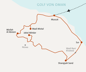 <Am Vormittag Flug von Ihrem Heimatflughafen nach Muscat, wo wir in der Nacht ankommen. Nach Erledigung der Einreiseformalitäten werden wir von einem ASI-Vertreter empfangen und zum Hotel gebracht.
