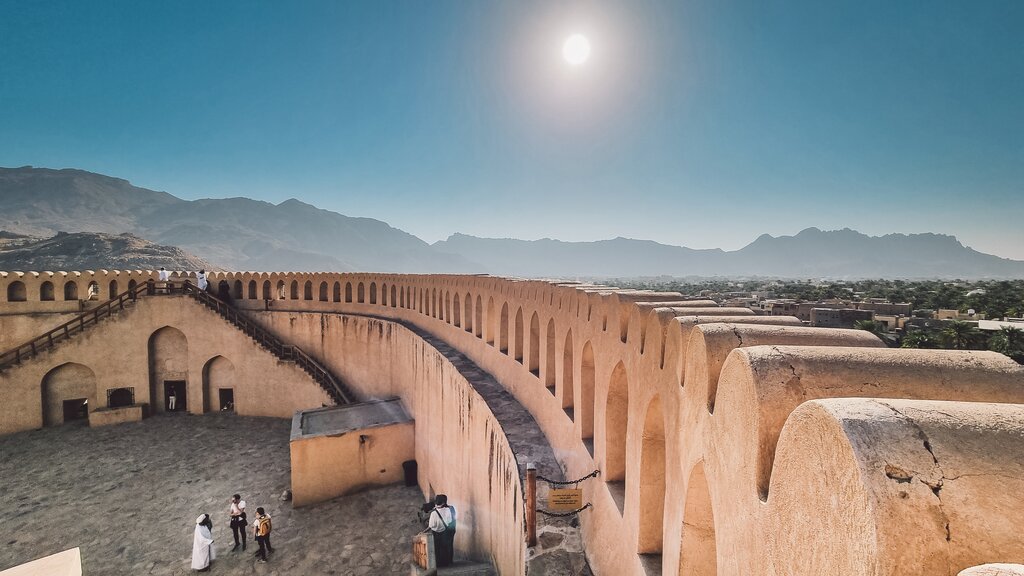 <Heute entdecken wir Nizwa, das geistige und kulturelle Zentrum des Sultanats. Wir spazieren durch die historische Stadt und fahren weiter nach Jabrin, wo uns kunstvolle Deckenmalereien und die elegante Festung erwarten. In Bahla bestaunen wir die mächtige Lehmfestung, die zum UNESCO-Welterbe zählt. Am Nachmittag erreichen wir das Bergdorf Misfath al Abreen. Zwischen grünen Terrassenfeldern und Lehmhäusern schlendern wir durch Gärten und enge Gassen und erhalten Einblicke in die traditionelle Landwirtschaft der Bergbewohner.
