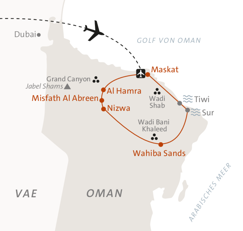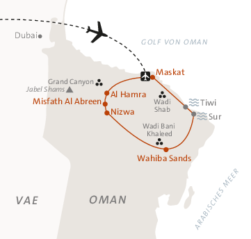 Das Sultanat Oman, mit seiner Kultur, Tradition und der zauberhaften, vielfältigen Landschaft, ist noch immer ein Geheimtipp unter den Orient-Reisen. Auf dieser Reise entdecken wir die Höhepunkte des Landes: die goldenen Dünen der Wahiba Sands, das Jabel-Shams-Plateau mit seinen atemberaubenden Canyons und beeindruckende UNESCO-Welterbestätten. Palmenumsäumte Oasen, glasklare Süßwasserbecken und historische Lehmstädte lassen uns den Zauber Omans mit allen Sinnen erleben.