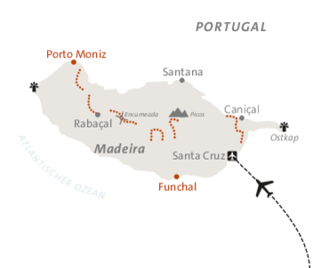 <Nach dem Frühstück treffen wir uns mit dem Wanderführer um 8:30 Uhr an der Rezeption des Hotels zum gegenseitigen Kennenlernen. Bitte bereits in voller Wanderausrüstung erscheinen. Nach kurzer Fahrt erreichen wir Machico, die erste Siedlung, die auf Madeira gegründet wurde. Hier beginnt unsere Wanderwoche: vom Strand von Machico hinauf zum Pico do Facho – von dort hat man einen tollen Blick bis zum Ostkap. Durch Obst- und Gemüseterrassen führt unser Weg stetig bergauf und bringt uns direkt zur Nordküste und zum Boca do Risco, wo die Klippen steil in den Atlantik abfallen. Im Norden schimmert die Insel Porto Santo, während unter uns der Atlantik wogt. In ständigem Auf und Ab wandern wir an der Küste entlang und genießen den Weitblick – die Aussichten sind fantastisch! Endpunkt der Tour ist etwas oberhalb von Porto da Cruz, nahe dem markanten Adlerfelsen. Bei einem leckeren Mittagessen stärken wir uns für die kommenden Tage.