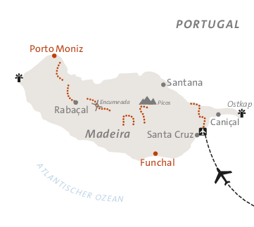 <Nach dem Frühstück treffen wir unseren Wanderführer um 8:30 Uhr an der Hotelrezeption – bitte bereits in Wanderausrüstung erscheinen. Gemeinsam starten wir in unser Madeira-Abenteuer. Unser Bus bringt uns nach Machico, der ältesten Siedlung Madeiras. Vom goldenen Strand von Machico steigen wir hinauf zum Pico do Facho, einem Aussichtspunkt mit fantastischem Blick bis zum Ostkap. Weiter geht es durch terrassierte Obst- und Gemüsegärten stetig bergauf, bis wir die wilde Nordküste erreichen. Am Aussichtspunkt Boca do Risco fallen die Klippen dramatisch ins Meer ab. Im Norden erkennen wir die Nachbarinsel Porto Santo, tief unter uns brandet der Atlantik an die Felsen. Auf schmalen Pfaden wandern wir in ständigem Auf und Ab entlang der steilen Küste und genießen dabei spektakuläre Weitblicke. Die Tour endet oberhalb von Porto da Cruz, beim markanten Adlerfelsen. Bei einem gemütlichen Mittagessen in einem lokalen Restaurant stärken wir uns für die kommenden Wandertage.