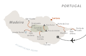 Madeira zu bereisen ist, als würde man in eine andere Welt eintauchen: Weihnachtssterne wachsen hier zu mannshohen Sträuchern, Baumheiden ragen wie Tannen in den Himmel, und Lorbeerbäume werden zu uralten Riesen. Doch nicht nur die exotische Pflanzenwelt beeindruckt – auch Madeiras Landschaft ist voller Kontraste. Spektakuläre Steilküsten und idyllische Täler, schroffe Gipfel und sattgrüne Wälder wechseln einander ab und ziehen uns sofort in ihren Bann. Die Menschen auf Madeira sind lebensfroh, herzlich und stolz auf ihre Insel. Auf dem fruchtbaren Eiland gedeiht fast alles: Von tropischen Früchten über Wein bis hin zu den berühmten Blumen – Madeira macht seinem Beinamen Blumeninsel alle Ehre. Erlebe Madeira aktiv, ohne auf Komfort zu verzichten – du übernachtest in der 4*-Quinta do Furão, die spektakulär auf einer Klippe über dem Atlantik gelegen ist.