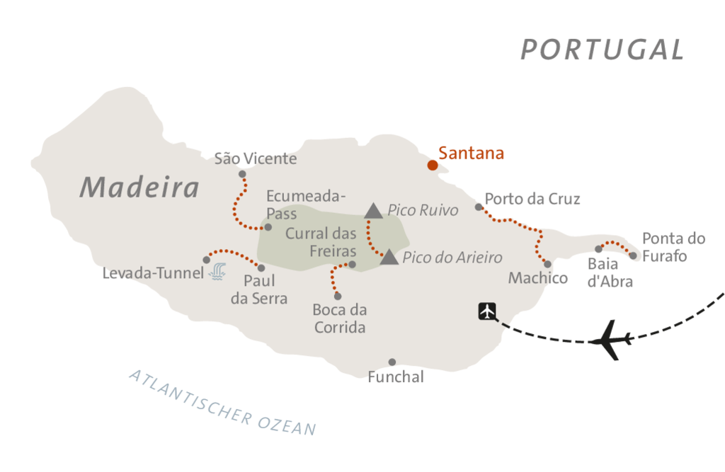 <Wir kommen auf Madeira an, wo uns ein ASI-Vertreter herzlich in Empfang nimmt und zu unserer Unterkunft begleitet. Den Rest des Tages können wir nach Belieben gestalten – vielleicht einen ersten Spaziergang unternehmen, den Blick auf den Atlantik genießen oder am Hotelpool entspannen. Unsere offizielle Begrüßung durch den ASI-Wanderführer findet am nächsten Morgen (Tag 2) statt.