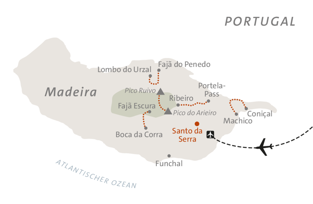 <Eine kurze Busfahrt bringt uns ins Herz der Insel zur Boca da Corrida. Von diesem Aussichtspunkt genießen wir einen ersten atemberaubenden Blick auf Madeiras zentrales Bergmassiv. Hier beginnen wir unsere Wanderung: Ein wunderbar angelegter Pfad führt uns durch eine überwältigende Bergwelt bis zum Fuße des markanten Pico Grande. Anschließend windet sich der Weg in engen Serpentinen hinab ins abgeschiedene Tal der Nonnen. Unten angekommen, kehren wir bei Senhor Gabriel in seinem urigen Gasthaus ein und lassen uns lokale Köstlichkeiten schmecken – ein unvergesslicher Abschluss für diesen Wandertag.