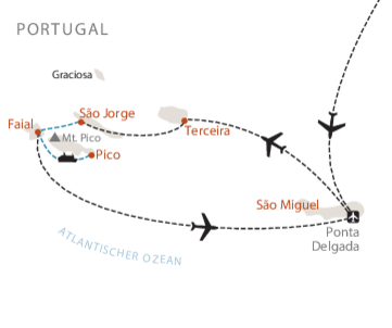 Auf halbem Weg zwischen Europa und Amerika liegt die Inselgruppe der Azoren. Das gesamte Archipel ist vulkanischen Ursprungs. Durch die späte Besiedelung konnte sich eine einzigartige Vegetation entwickeln, die auch heute noch erhalten ist. Wir besuchen insgesamt fünf Inseln: São Miguel, Terceira, São Jorge, Faial und Pico. Alle sind faszinierend, unterschiedlich und einzigartig. Wir entdecken heiße Quellen, Vulkanseen und den gewaltigen Vulkan Pico, lernen die typische Lebensweise der Einheimischen kennen und genießen kulinarische Spezialitäten.