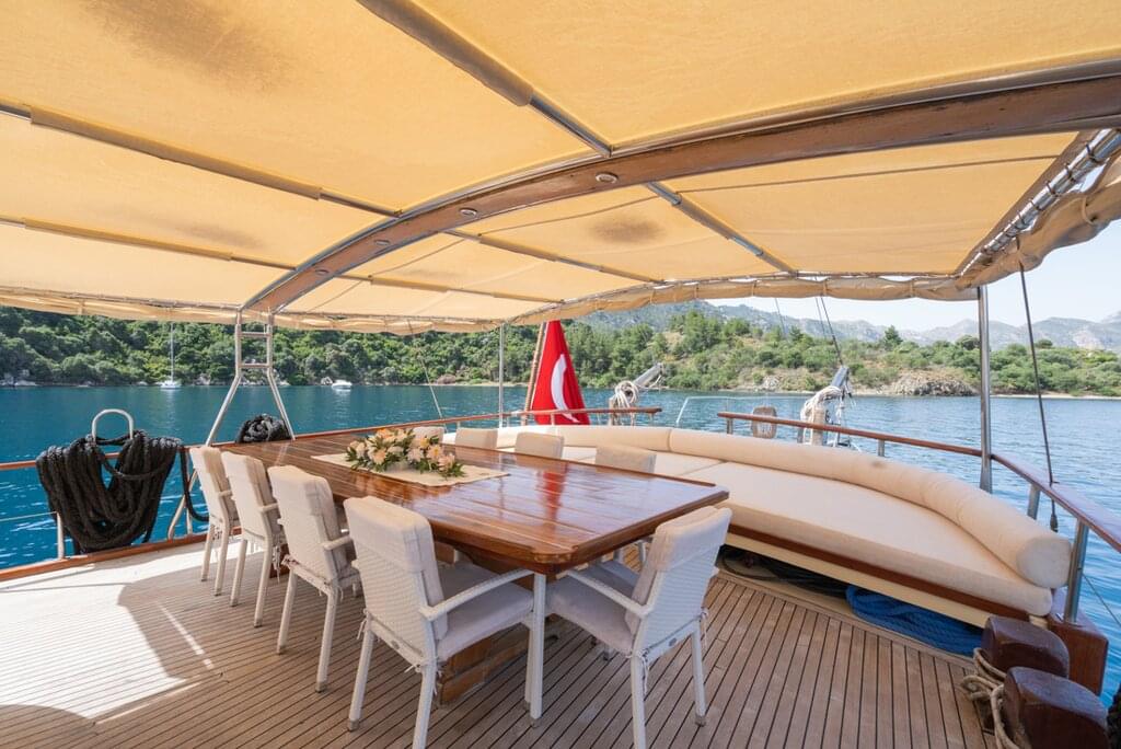 <Heute Morgen setzt du die Segel in Richtung des abgelegenen Strandes von Kadirga. Dort angekommen, kannst du dich bei einem erfrischenden Bad erholen, in der Sonne entspannen und zu Mittag essen. Danach fährst du weiter nach Bozukkale, wo du die Nacht verbringst. Nimm das Abendessen an Bord ein und entspanne dich unter dem Sternenhimmel.