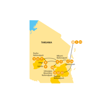 - 6 Safaris im Geländewagen, 1 Safari zu Fuß, 1 Bootsafari und 1 Nachtsafari im Nyerere-NP; Wanderung im Udzungwa-Mountains-NP