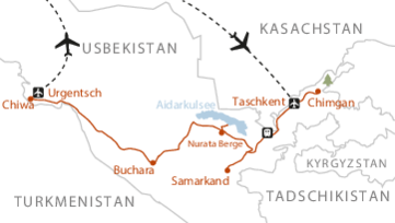 <Am Vormittag Flug von Ihrem Heimatflughafen nach Taschkent, wo wir in der Nacht ankommen. Nach Erledigung der Einreiseformalitäten werden wir von einem ASI-Vertreter empfangen und zum Hotel gebracht.
