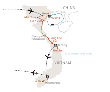Auf unserer Reise durch Vietnam erleben wir das Land in all seinen Facetten. Im Tal von Mai Chau bekommen wir einen authentischen Einblick in das Leben der Bergvölker. In der Halong Bay gleiten wir per Boot durch eine zauberhafte Inselwelt. Wir besuchen die eindrucksvollen Höhlen im Phong Nha Nationalpark und lernen die Kaiserstadt Hue kennen. In Hoi An haben wir die Gelegenheit, durch die charmante Stadt zu schlendern, bevor es in die Metropole Saigon weitergeht. Zum Ausklang verbringen wir am Ende der Reise eine Nacht in einer wunderschönen Lodge im Mekong Delta.