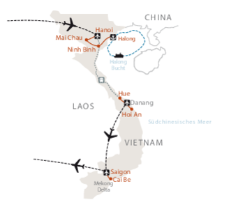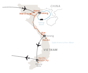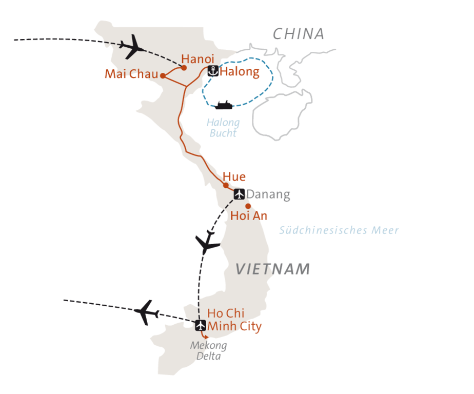 Auf dieser faszinierenden Wanderreise durch Vietnam erleben wir das ganze Land in all seinen Facetten. Wir starten unsere Reise in der quirligen Metropole Hanoi, wo wir die Sehenswürdigkeiten der Stadt sowie die Einheimischen bei einem gemeinsamen Kochkurs kennen lernen. Von dort begeben wir uns in die idyllische Bergwelt um Mai Chau, wandern über Reisfelder und entlang uriger Dörfer mit ihren charakteristischen Stelzenhäusern. Wir besichtigen die Kaiserstadt Hue mit ihren über 50 Denkmälern, wandern in den Marmorbergen und erkunden das Mekong Delta mit seinen schwimmenden Märkten.